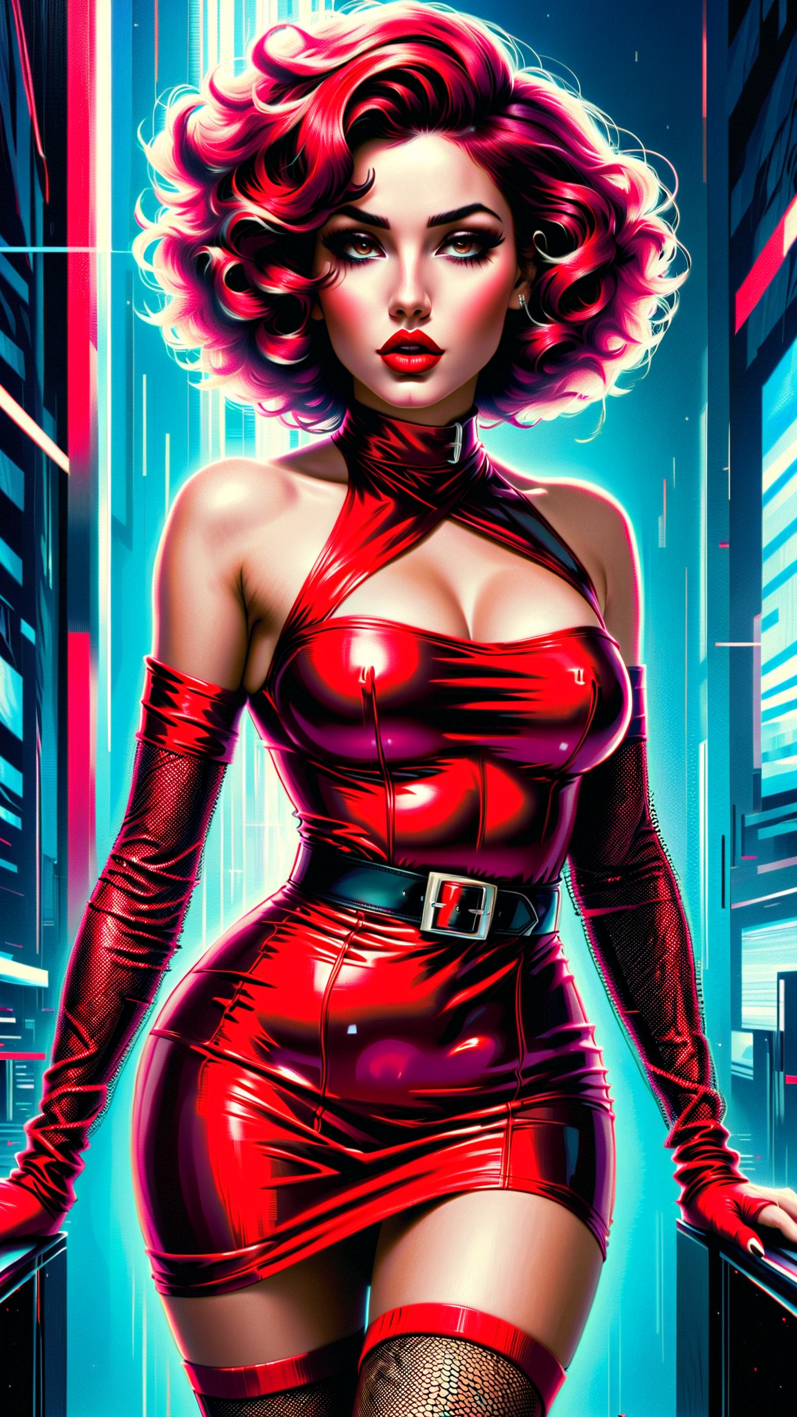 Old Hollywood meets modern pop culture, and she's got that Boop-Boop-be-doop! She's also a supervillain capable of blowing you down with her kisses! The power blasts forward from her in red lip-shaped energy! feminine woman, young Caucasian female. Actress, sort of like Betty Boop. Red is her favorite color! Fun, vivacious, lively, glamorous. Tall, leggy, strong, fit, busty, thin but curvy. Beautiful face, sparkling Hazel eyes with long eyelashes. Medium length hair to her shoulders, with fluffy bouncy burgundy colored curls, glamorously styled. Usually dark sunglasses perched on top of her head. Shiny, glossy ruby-red lips, usually blowing kisses. Shiny, glimmering red mini-dress with cut-out shoulders, form fitting material. Black leather designer belt around her waist. The dress is slit on one side. Red fishnet stockings on her legs, with knee-high red stiletto heeled boots on her feet. Her power is her lips, blowing kisses from the other side of the room. Full body pose.