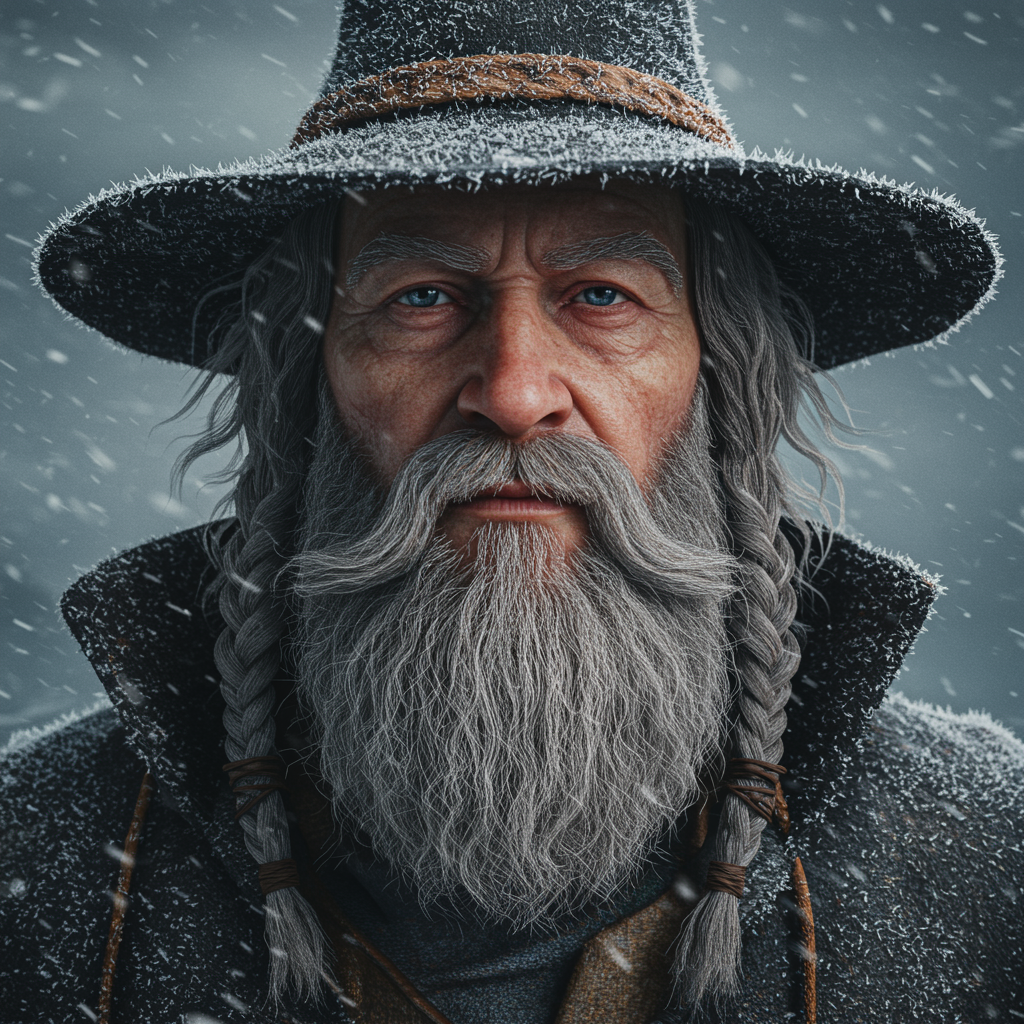 Old man with a long beard and sidelocks, wearing a distinctive hat, standing in a windswept setting. The scene is beautifully lit with studio-quality lighting and vibrant, saturated colors, highlighting intricate details and perfect facial features. The image embodies ultra-realism and photorealism, with ultra-sharp, detailed eyes that capture reflections and ultra-sharp, detailed skin. His vibrant, meticulously detailed hair adds to the storybook illustration style, creating a freezing, dramatic atmosphere with cinematic lighting. Rendered with hyper-detail using an unreal engine with volumetric lighting, the scene boasts an 8k resolution. Despite being HDR low-res, it is free of text, errors, and poorly drawn elements like extra digits, cropped or disfigured parts. The composition refrains from tiling, bad art, and avoids signatures, watermarks, or any deformities, maintaining its aesthetic appeal without any blurry, fuzzy, or misshaped anomalies.