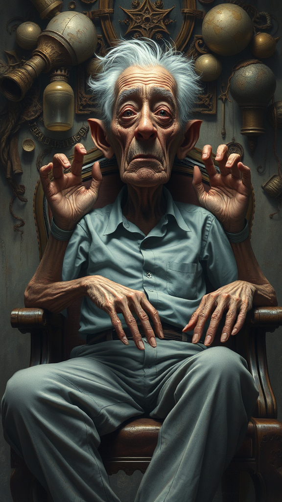 Old man seated in a chair, surrounded by an intricate, complex array of artistic elements in the background, capturing a close-up, detailed painting style with a cinematic, cartoon-like approach. The scene is set in a fantasy world with low saturation and a subtle vignette effect. The character is uniquely deformed with bad anatomy, featuring disfigured and mutated limbs, giving an impression of a distorted and surreal figure. The hands are poorly drawn, with some limbs floating, disconnected, or even missing, adding to the complex and bizarre nature of the image. The face might appear as a doubled or distorted version, emphasizing the strange and fantastical theme.
