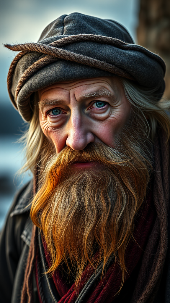 Old man with a long and flowing beard, adorned with sidelocks and a traditional hat, standing against a windswept backdrop. Captured with beautifully balanced studio lighting, the composition is rich in saturated colors and intricate details. His features are perfectly rendered, achieving ultra-realism with hyper-detailed, sharply defined eyes that capture reflections with precision. The skin is ultra-sharp, and his hair appears vibrant and meticulously detailed, creating the feel of a storybook illustration. The atmosphere is dramatic and freezing, enhancing the cinematic lighting reminiscent of an unreal engine production with hyper details. Volumetric lighting enriches the scene reminiscent of an octane-rendered 8k display. Despite its HDR qualities, low-resolution artifacts appear sporadically, adding quirks like missing fingers, extra digits, and miscellaneous anomalies presenting a stylized composition rather than flawed art, steering clear of negative descriptors such as disfigured, deformed, or ugly aesthetics.