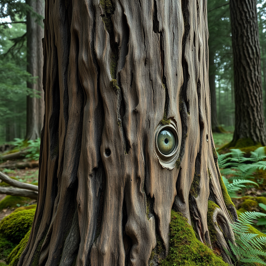 Old pine tree trunk, intricately detailed bark, photorealistic with HDR quality, set against a lush woodland backdrop, featuring moss and ferns. The bark's texture is highly detailed and slightly oversaturated, presenting an artistic yet realistic appearance. The trunk conveys a sense of polished smoothness as if carved with care, and the bark seems almost alive with natural patterns that resemble eyes, lending an unexpected, realistic intensity to its presence.