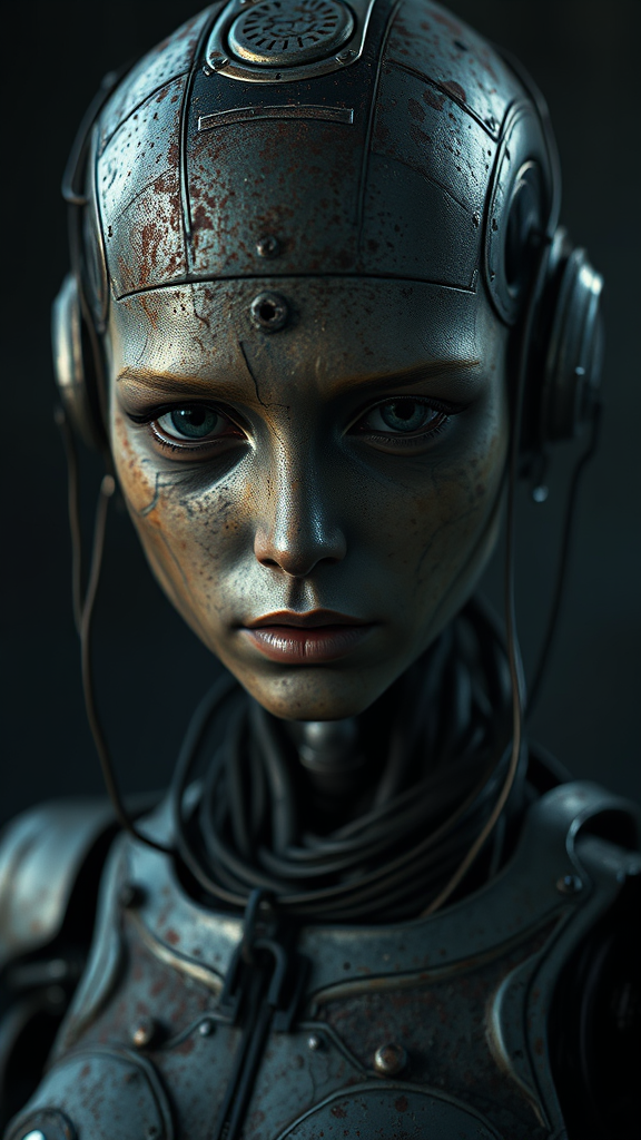 Old weathered female robot with a metallic exterior, showing signs of rust and visible wires; she appears destroyed and sad, gazing directly at the viewer. The portrait aims to capture a realistic and detailed depiction with an emphasis on her textured, aged skin. The scene reflects a dark and dirty atmosphere, rendered in 8k resolution, embodying hyperrealism. Piercing, diffused soft lighting highlights her features, employing a shallow depth of field and sharp focus for cinematic impact. Created using CGI techniques, the scene maintains elements of imperfection, including potential text errors, blurred areas, cropping, and other distortions like extra or missing limbs, emphasizing a sense of decay and imperfection. The low-quality aspects include jpeg artifacts, poorly drawn elements, and other deformations, contributing to a morbidly fascinating portrayal of a once functional, now deteriorated, robotic being.