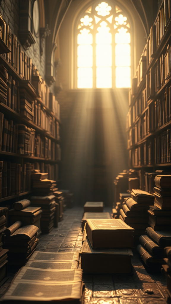 Old weathered scrolls and ancient tomes in a medieval library, golden hour lighting, captured with professional photography, octane render, hyper realistic with stunning natural light, Dynamic composition, sharp focus, Bokeh effect, analog style, featuring elements slightly out of frame, reminiscent of childhood wonder, avoiding elements like low resolution, flawed anatomy, or digital imperfections.