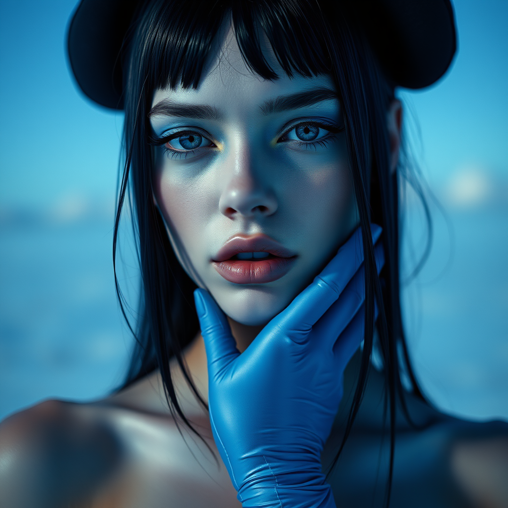 Olga Moyb in a mesmerizing dark blue and sky-blue composition, captured by Juana Roque for W Magazine, exuding a futuristic pop vibe. The scene evokes the style of Anne Geddes with an intense close-up focus, adorned with imaginative body extensions and digitally enhanced features. The artwork also draws inspiration from Felicia Simion’s unique perspective, resulting in a 200:269 aspect ratio masterpiece.
