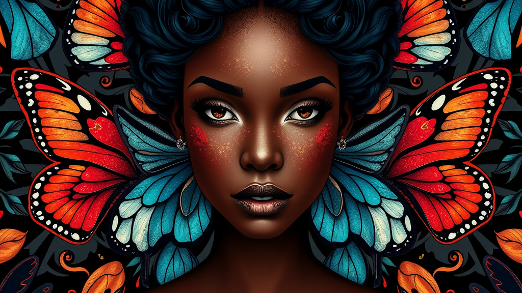 Olpntng style, elegant black woman, seamless, Damascus butterfly pattern, symmetrical, vector illustration, inspired by Tom Bagshaw, Greg Rutkowski, Makoto Shinkai, Lois Van Baarle, and Ilya Kuvshinov, featuring a luxury color palette with splashes of color. This intricate and detailed high-quality design showcases sharp edges and ultra-precise strokes, akin to heavy oil painting strokes with subtle paint effects. The composition highlights beauty and harmony with an emphasis on intricate patterns and balanced proportions.