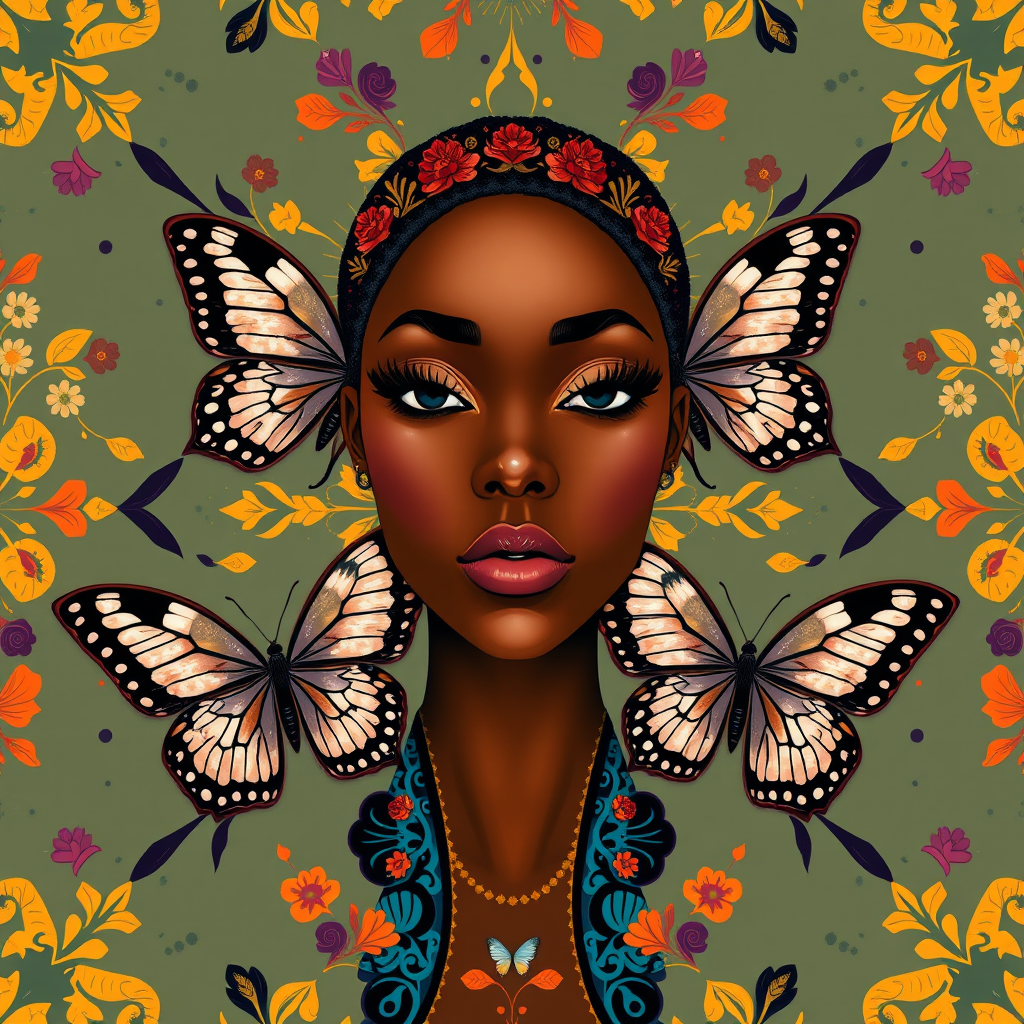 Olpntng style, featuring a black woman with a seamless butterfly pattern inspired by the intricate designs of Damascus. The symmetrical vector illustration blends influences from Tom Bagshaw, Greg Rutkowski, Makoto Shinkai, Lois Van Baarle, and Ilya Kuvshinov. Utilizing a luxurious color palette accented with vibrant splashes, the work is detailed and high-quality, with sharp edges and ultra-precise strokes reminiscent of oil painting techniques. The illustration is characterized by heavy strokes and subtle paint dripping effects, capturing an essence of elegance and artistic precision.