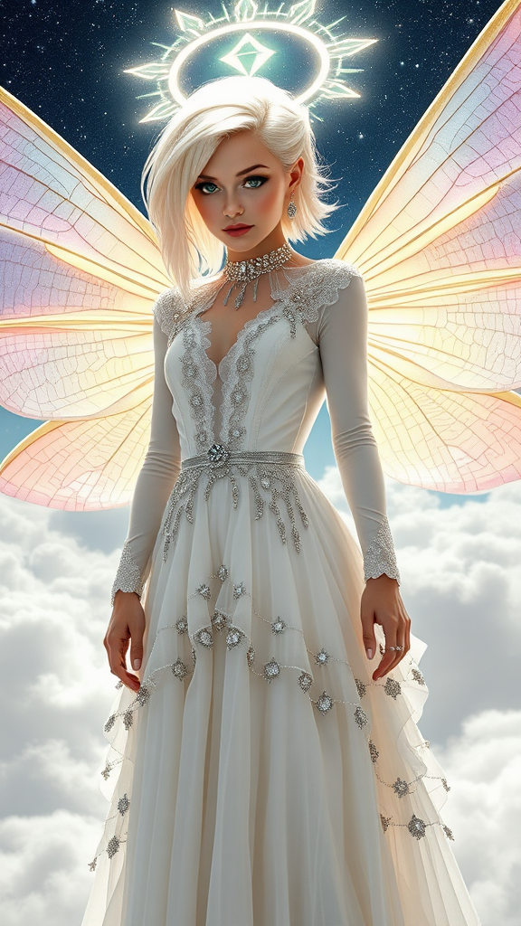 Omniversal Archangel, Faery Queen with Archangel powers. feminine female. Sylph, fairy. Regal, royal, elegant. Cosmic, universal. Tall, statuesque. Beautiful young face, chartreuse green eyes with long blond lashes; her eyes have looked into eternity. Short white-gold hair, side swept on one side and swept up locks falling to one side. Over her head is a halo made of stars, with the center star being the brightest {{{halo made of stars}}}. Elvish ears. Delicate model face with glossy pink lips. A white lace collar with a diamond at the center around her neck. She wears a white, long sleeved, tiered floor length gown, embedded with white crystals, a silver belt with diamonds around her waist. The tiered bottom half of her dress is embedded with diamonds. On her back is an enormous, over-sized pair of dragonfly wings, translucent and iridescent with all the colors of the rainbow. She wears a pair of silver high heels with silver gladiator straps. She leaves a cloud of glitter wherever she flys, and is constantly surrounded by sprites of both sexes. She shines with a silver light/aura, a heavenly glow wherever she is. Full body pose, flying through the clouds, dawn is approaching...