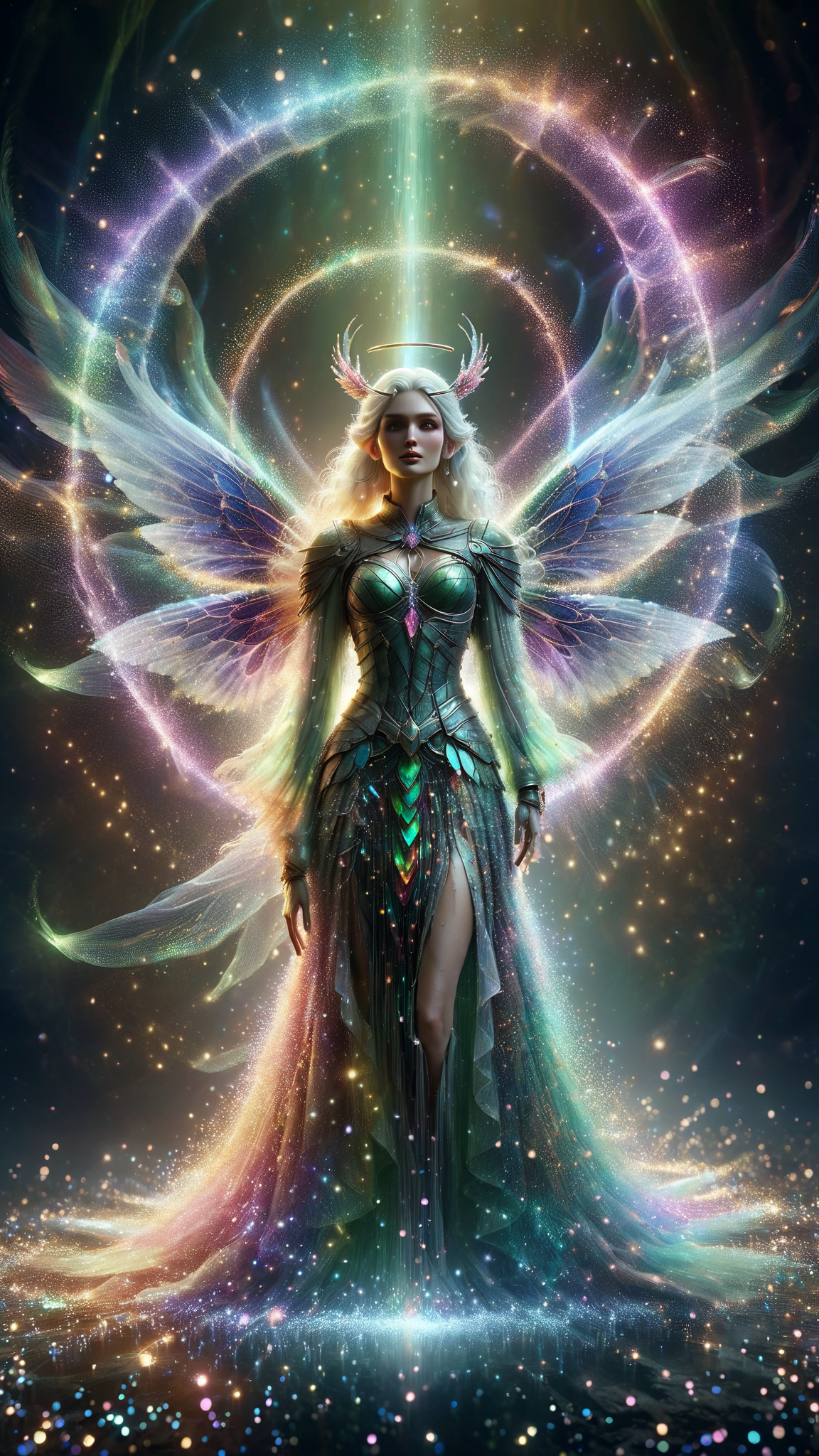 Omniversal Archangel, Faery Queen with Archangel powers. feminine female. Sylph, fairy. Regal, royal, elegant. Cosmic, universal. Tall, statuesque. Beautiful young face, chartreuse green eyes with long blond lashes; her eyes have looked into eternity. Short white-gold hair, side swept on one side and swept up locks falling to one side. Over her head is a halo made of stars, with the center star being the brightest {{{halo made of stars}}}. Elvish ears. Delicate model face with glossy pink lips. A white lace collar with a diamond at the center around her neck. She wears a white, long sleeved, tiered floor length gown, embedded with white crystals, a silver belt with diamonds around her waist. The tiered bottom half of her dress is embedded with diamonds. On her back is an enormous, over-sized pair of dragonfly wings, translucent and iridescent with all the colors of the rainbow. She wears a pair of silver high heels with silver gladiator straps. She leaves a cloud of glitter wherever she flys, and is constantly surrounded by sprites of both sexes. She shines with a silver light/aura, a heavenly glow wherever she is. Full body pose, flying through the clouds, dawn is approaching...