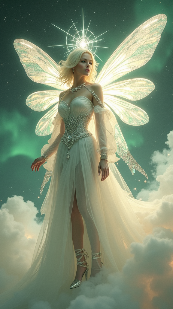 Omniversal Archangel, Faery Queen with Archangel powers. feminine female. Sylph, fairy. Regal, royal, elegant. Cosmic, universal. Tall, statuesque. Beautiful young face, chartreuse green eyes with long blond lashes; her eyes have looked into eternity. Short white-gold hair, side swept on one side and swept up locks falling to one side. Over her head is a halo made of stars, with the center star being the brightest {{{halo made of stars}}}. Elvish ears. Delicate model face with glossy pink lips. A white lace collar with a diamond at the center around her neck. She wears a white, long sleeved, tiered floor length gown, embedded with white crystals, a silver belt with diamonds around her waist. The tiered bottom half of her dress is embedded with diamonds. On her back is an enormous, over-sized pair of dragonfly wings, translucent and iridescent with all the colors of the rainbow. She wears a pair of silver high heels with silver gladiator straps. She leaves a cloud of glitter wherever she flys, and is constantly surrounded by sprites of both sexes. She shines with a silver light/aura, a heavenly glow wherever she is. Full body pose, flying through the clouds, dawn is approaching...