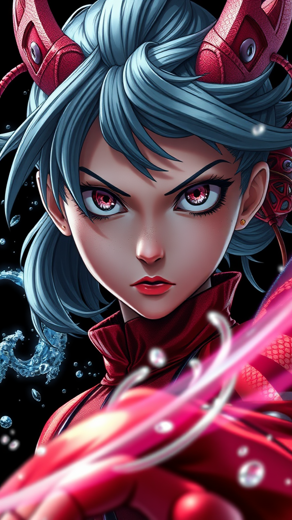 On a black background, depict One Punch Man's Tornado character gazing directly at the viewer. Render her in a hyper-detailed, realistic style that blends the mesmerizing quality of marine scenes with the whimsical elements of dolly kei and the mythical flair of dragoncore. The scene should feature realistic figure detailing with a close-up focus. Emphasize vibrant, expressive colors and textures to enhance the visual impact. The arrangement should be in a 4:7 aspect ratio, utilizing expressive styling and dynamic composition for a striking, immersive effect.