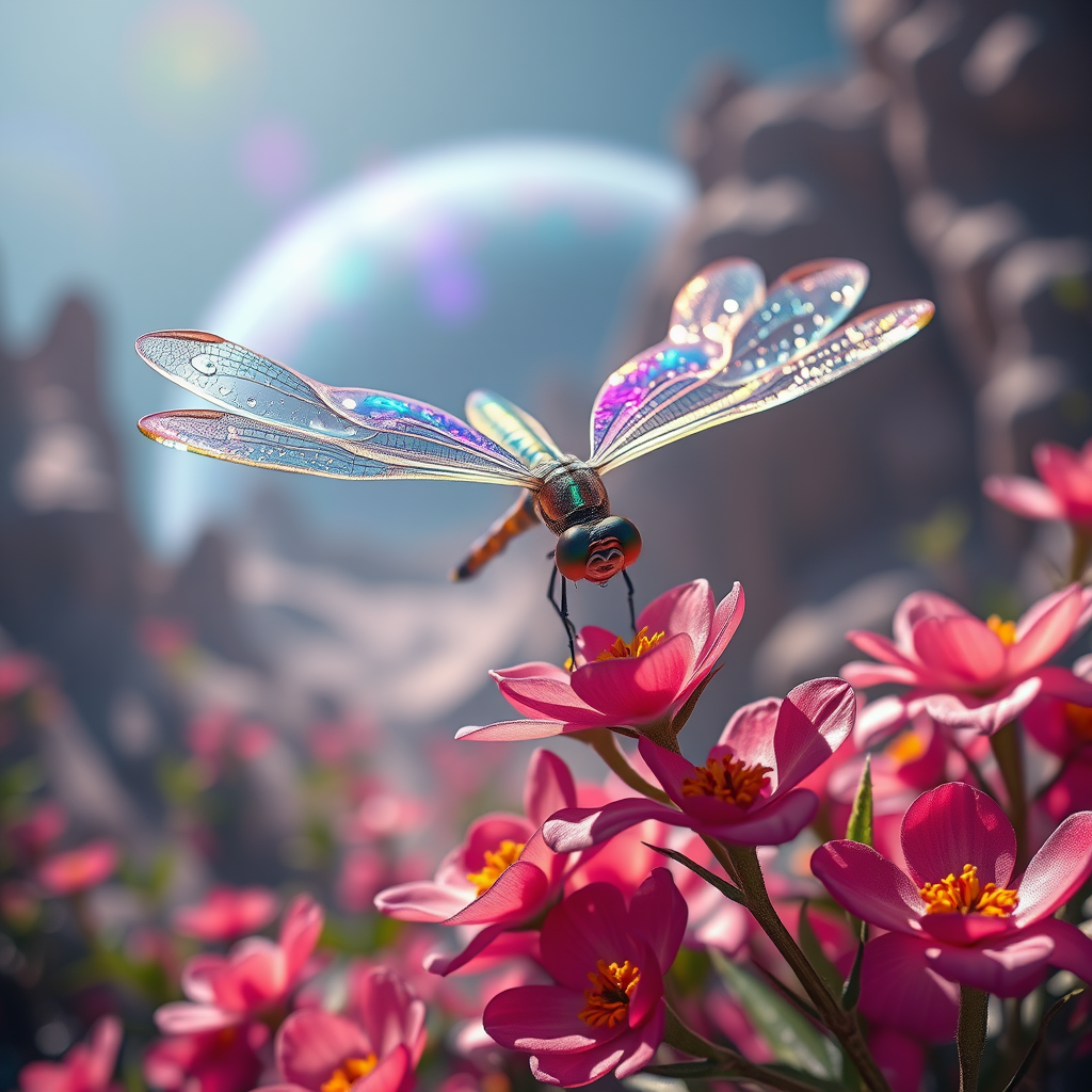 On a breathtaking alien planet, the focal point of the image is a shimmering, wide-winged extraterrestrial dragonfly, its crystalline form iridescent under the planet's otherworldly light. The dragonfly hovers gracefully above exotic blooms, savoring their intoxicating scent amid a tapestry of vibrant alien flora. Captured through the lens of a Canon EOS R6 mirrorless camera, paired with an RF 100mm f/2.8L Macro IS USM, the image is a testament to the lens's renowned sharpness and exceptional color rendition. The settings—an aperture of f/4, ISO 400, and a shutter speed of 1/800 sec—are meticulously chosen to emphasize the dragonfly's exquisite beauty and its mesmerizing environment. Dazzling colors from the planet's atmosphere bathe the scene, casting a mystical glow on the translucent insect and highlighting the diverse hues and unearthly shapes of the flora. This captivating image draws viewers into a world of wonder and mystery, showcasing the limitless splendor of the cosmos in an undiscovered realm.