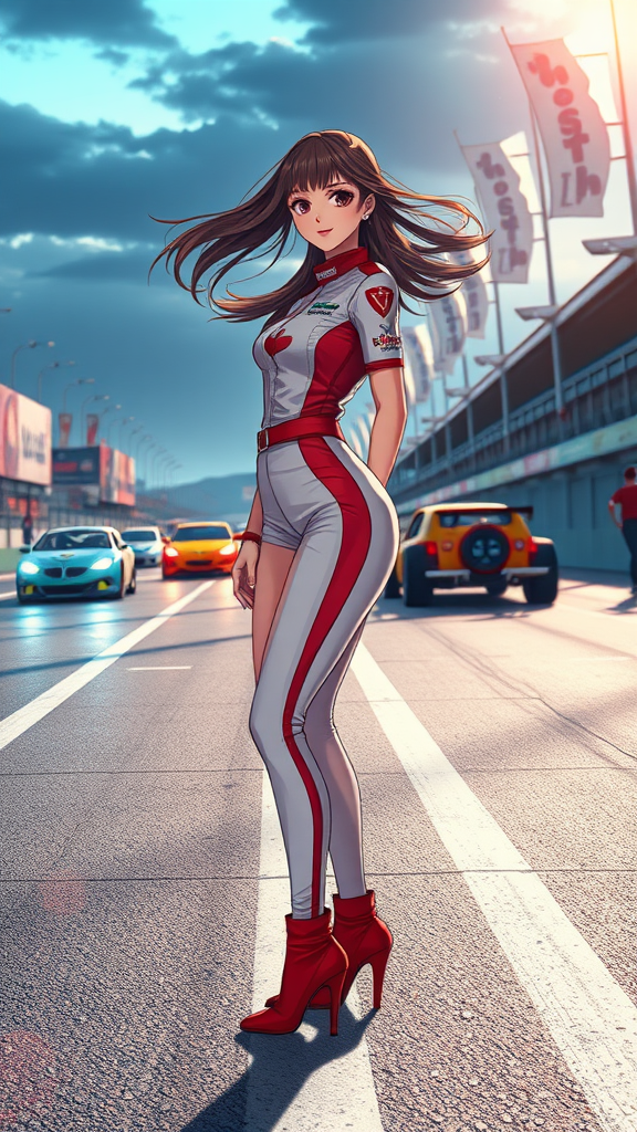 On a bustling race track during a vibrant racing festival, the scene is set with dramatic light casting long shadows across the pavement. Anime-inspired racing cars, reminiscent of Redline, speed past in a blur, reflecting the high-octane excitement of a NASCAR event. In the foreground stands a strikingly beautiful girl with model-like appearance; her slim waist, perfect figure, and long, elegant legs are accentuated by a tight racing suit that hugs her form. Her long, flowing hair catches the wind, adding dynamic movement to the symmetrical composition of the scene. Displayed in a long shot from a first-person perspective, her confident pose captures the spirit of the festival. The artwork, rendered in exquisite ultra detail, high contrast, and high resolution, embodies the vibrant essence of anime and manga graphics, offering an immersive experience in stunning 8K HD super-resolution.