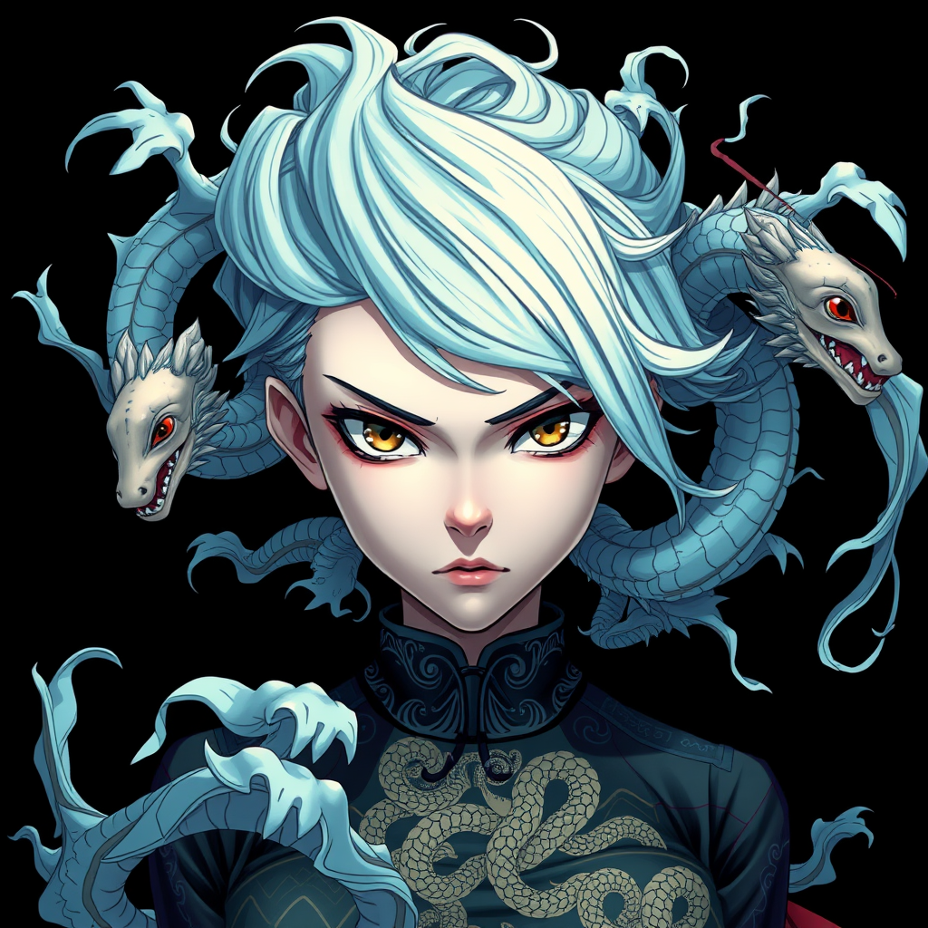 On a deep black background, depict the One Punch Man character Tornado gazing intensely at the viewer. The scene is rendered in a hyper-detailed and realistic style, intertwined with mesmerizing marine elements, incorporating flowing waves and sea creatures gently enveloping her form. Her outfit is inspired by dolly kei fashion with intricate dragoncore patterns adding a mystic flair. The focus is a close-up on her expressive face, capturing her determined gaze. The overall composition feels like a vivid dreamscape, blending realistic figures with an otherworldly, magic-infused ambiance, all within an elongated aspect ratio of 4:7.