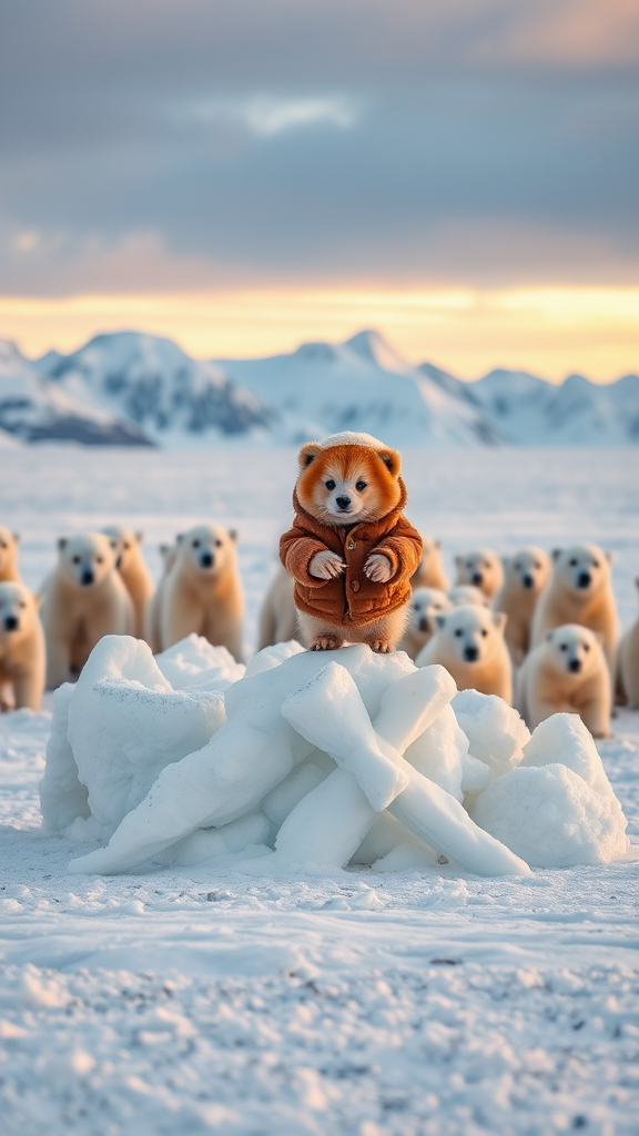 On a glistening ice field amidst a snow-covered landscape, a dozen juvenile polar bears gaze nonchalantly into the distance, their fur almost glowing with an ethereal softness, while beyond them, a dense wall of snow-capped mountains looms majestically in the fading light of a winter sunset. Amidst this serenity, a tiny ball of fluffy fur clad in a warm, earth-toned down jacket and matching hat stands atop a number of attempted snow sculptures, carefully posing for a photograph in the center of the group of small polar bears. The cat's vibrant fur is set off by a hot winter hat, adding a pop of color to the monochromatic backdrop of the white landscape. Casting a protective arm around the miniature polar bear to its immediate left, the cat's delicate features are accentuated by the high-quality camera focusing on its adorable countenance, drawing the audience's gaze instantly to the big-eyed, curious feline. Bracketing the cat from all sides, the small polar bears climb upon snow hills and lazy excursions, their youthfully playful demeanor in stark contrast to the cat's monumental maturity, and all of it photographed under the specialized lens that captures every intimate detail of their features in conjunction with every fluttering beat of the winter sky.