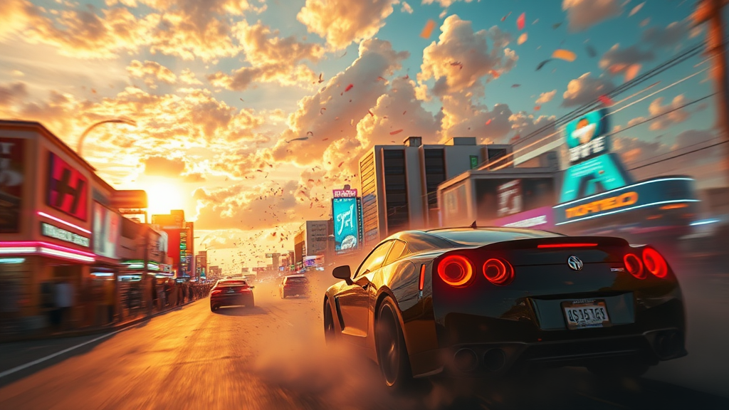 On a radiant sunny day, the sky ablaze with a stunning array of clouds at sunset, a sleek sports car races through the neon-lit streets of cyberpunk Miami. The city is alive with the glow of vibrant signs and throngs of onlookers. Confetti twirls through the air, mingling with dust and debris caught in gusty winds. Volumetric fog adds an otherworldly aura to the scene, enhancing the thrilling, epic action captured by a dynamic, sweeping camera perspective.