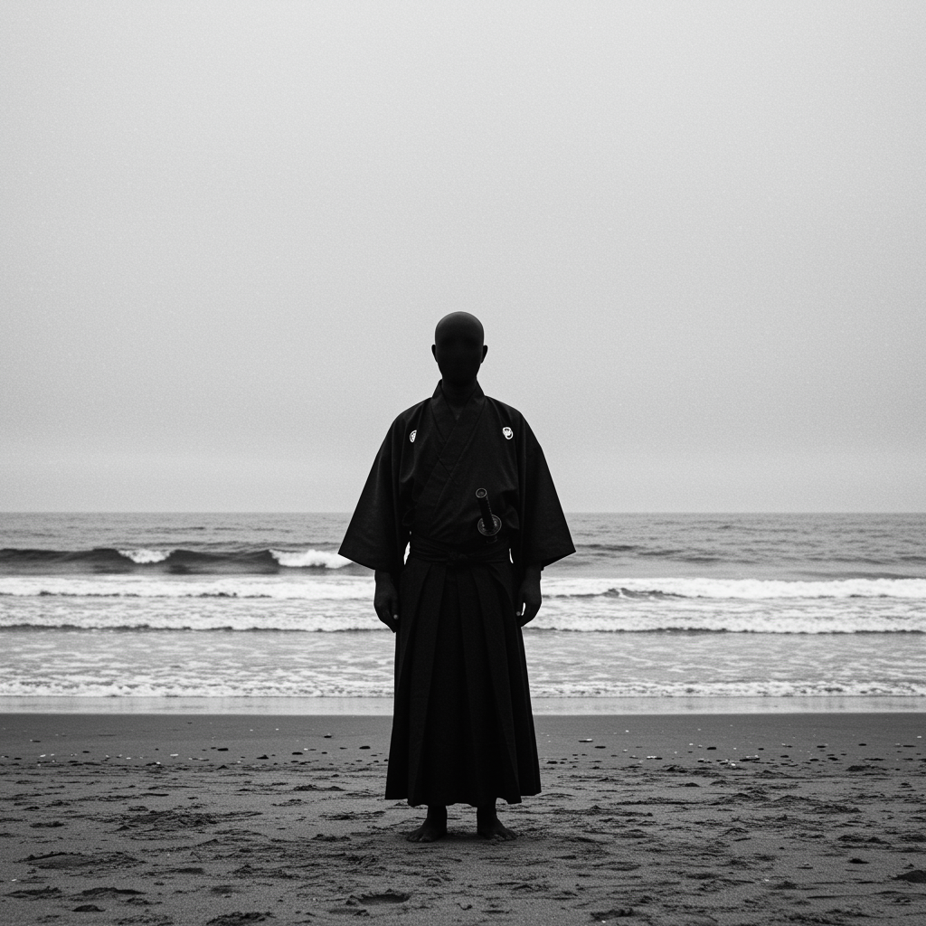 On a serene and endless stretch of sandy beach, a mysterious figure stands, captivating all who gaze upon him. He is faceless, yet the air around him pulses with profound emotion, as if his very essence speaks volumes. His presence is both haunting and deeply touching, as if his unseen eyes are watching us, seeing into the depths of our souls. Draped in the elegant flow of traditional Japanese attire, his robes dance gently with the ocean breeze, whispering secrets of a time long past. The interplay of his form against the backdrop of the vast, rolling sea creates a poignant tableau, evoking a sense of connection and introspection.