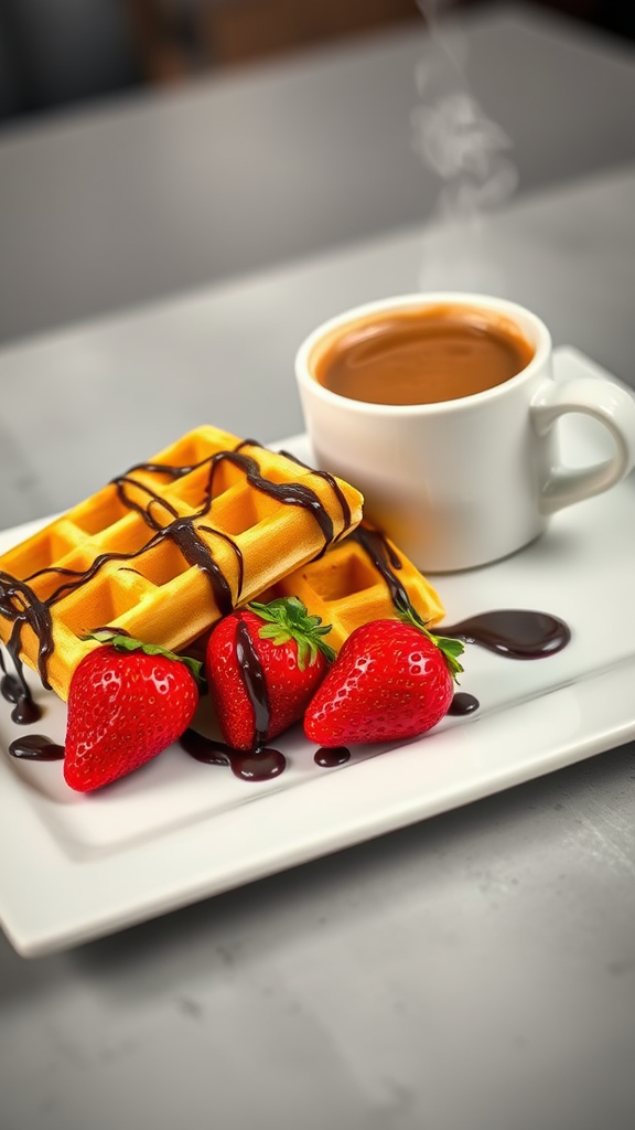 On a sleek white plate, golden yellow Viennese waffles are elegantly drizzled with rich dark chocolate, a perfect indulgence. Beside them sits a steaming cup of frothy cappuccino, its aroma mingling invitingly with the chocolate. Two bright, fresh strawberries lie on the plate, enhancing the visual feast. Captured in strikingly realistic food photography, the scene is expertly color-graded with soft attractive shadows and minimal contrast, highlighting the textures and warmth. The image is in immaculate focus, featuring a bokeh effect in the background to emphasize the enticing details, with dramatic lighting providing an artistic flair.