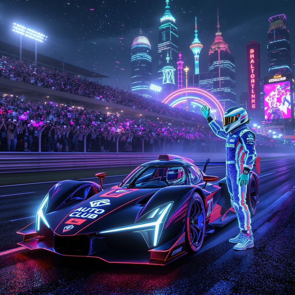 On a sun-soaked racetrack under the neon glow of towering city lights, a sleek car with a luminescent auto club logo hums with energy. Beside it, a racing driver, their suit a cascade of holographic patterns, secures a mirrored visor helmet with one hand while the other hand waves enthusiastically to a cheering crowd. The interior, visible through the transparent roof, reveals no driver or helmet, only swirling lights and an array of glowing controls. Enthusiastic spectators fill the stands and line the fences, their faces illuminated by vibrant, flickering screens. The vantage point captures the scene from a side-front angle, elevated slightly above the ground, adding a dynamic perspective to the cyberpunk spectacle.