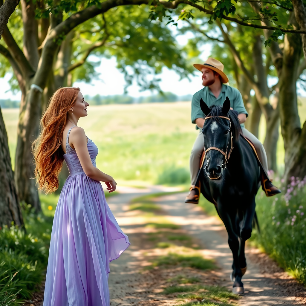 On a tranquil tree-lined path, a young woman in a flowing lavender dress and a man atop a black horse share an intimate moment. The woman, with her long auburn hair cascading down her back, stands gracefully to the left of the scene, her eyes captivated by the horse. Her lavender dress contrasts softly with the lush greenery surrounding her. The man on the horse, situated to the right, gazes warmly at the woman, his expression serene. Wearing a green shirt and a straw hat, he adds a fresh touch of color against the deep tones of the horse. The horse, a magnificent creature with a glossy black coat, stands majestically on the path. Behind them, a meadow, vibrant with wildflowers, unfolds, offering a picturesque backdrop. Soft, natural light filters through the canopy, casting gentle shadows on the ground. The scene exudes a peaceful and romantic ambiance, capturing a tender connection between the two in a beautiful outdoor setting.