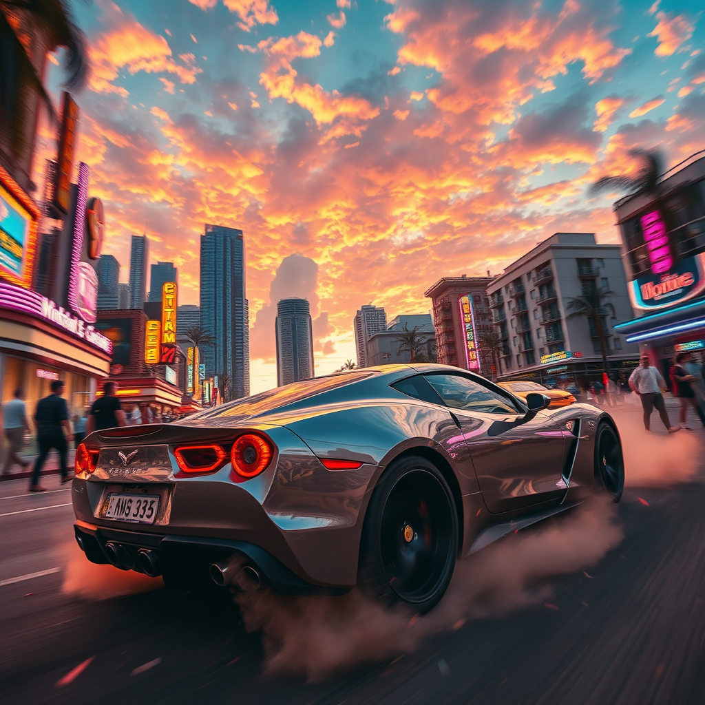 On a vibrant sunny day, a sleek sports car races through the electrifying streets of a cyberpunk Miami cityscape, where the sky is painted with a spectacular sunset framed by dramatic clouds. Neon signs cast colorful reflections on the carβs glossy surface as it speeds by, weaving through bustling crowds. Confetti and debris dance in the wind, mingling with dust and swirling volumetric fog, creating a mesmerizing backdrop for this thrilling, high-octane chase captured by an action camera.