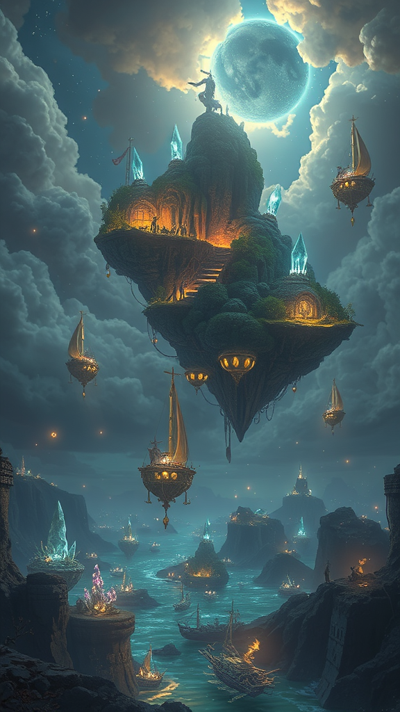 On an alternate Earth, floating islands drift through the sky, each sustained by its own unique ecosystem and powered by mysterious crystals that illuminate the world below; inhabitants navigate between these islands on airships, fostering an interconnected yet diverse society that thrives above an ocean teeming with luminescent sea creatures, reflecting the shimmering skies above.