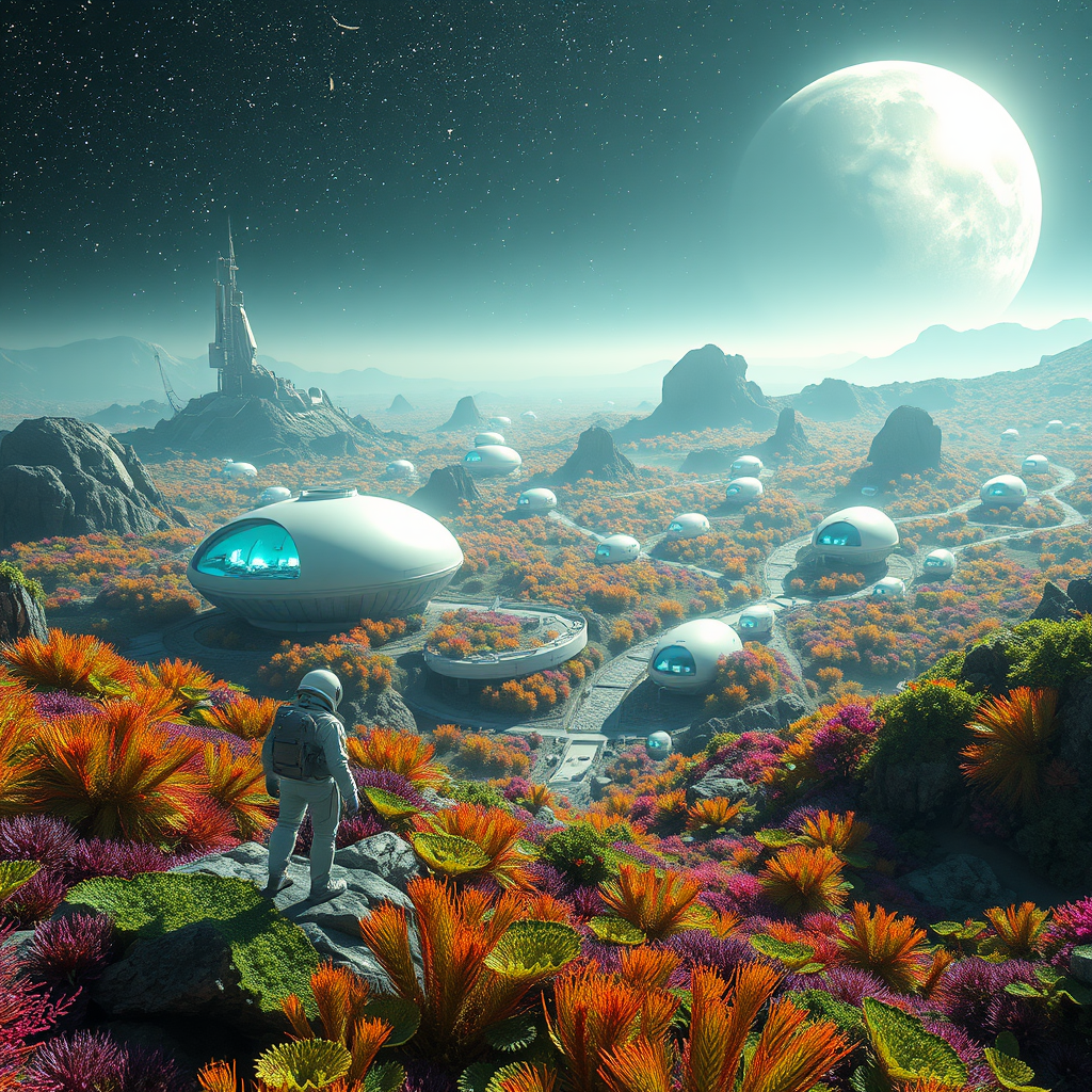On an uncharted planet, a human settlement emerges with sleek, white structures nestled amidst a vibrant panorama of colorful vegetation that seems to pulse with life. Underneath the celestial glow of bioluminescent plants, the scene is rendered in hyperrealism with meticulous precision, capturing lush details and intricate filigree patterns that resemble crystalline formations. The landscape is bathed in global illumination, creating a surreal atmosphere, while a lone cosmonaut explores this strange world that seems almost dreamlike. Low-resolution lens flares add to the mystical quality of the environment. Despite some surreal anomalies like textural errors and imperfect anatomy—such as missing or extra digits—the overall depiction remains astonishingly captivating, with occasional distortions lending an otherworldly charm. Hints of jpeg artifacts and subtle watermarks suggest a fusion of artistic imperfection and boundless imagination in this alien vista.