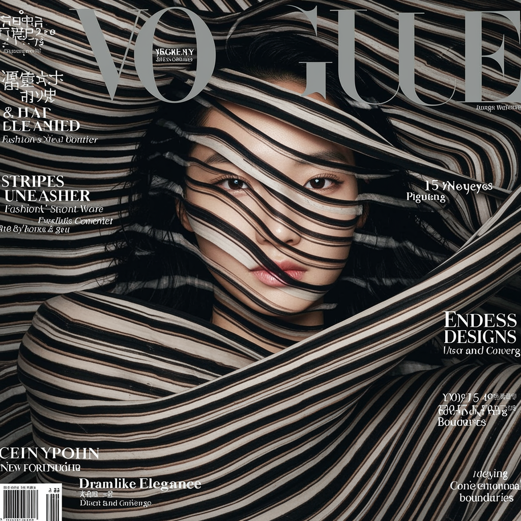 On the cover of VOGUE magazine, a captivating Chinese woman is enveloped in a mesmerizing vortex of swirling stripes. The fluid lines twist and dance around her, seamlessly merging her silhouette with the dynamic, surreal design. Her face, serene and partially obscured by the hypnotic waves of stripes, exudes an ethereal and otherworldly aura. The VOGUE logo stands boldly at the top, metallic and eye-catching against the intricate abstract backdrop. Cover highlights include: "Stripes Unleashed: Fashion's New Frontier," "Dreamlike Elegance: Where Art and Style Converge," "Endless Designs: Defying Conventional Boundaries."