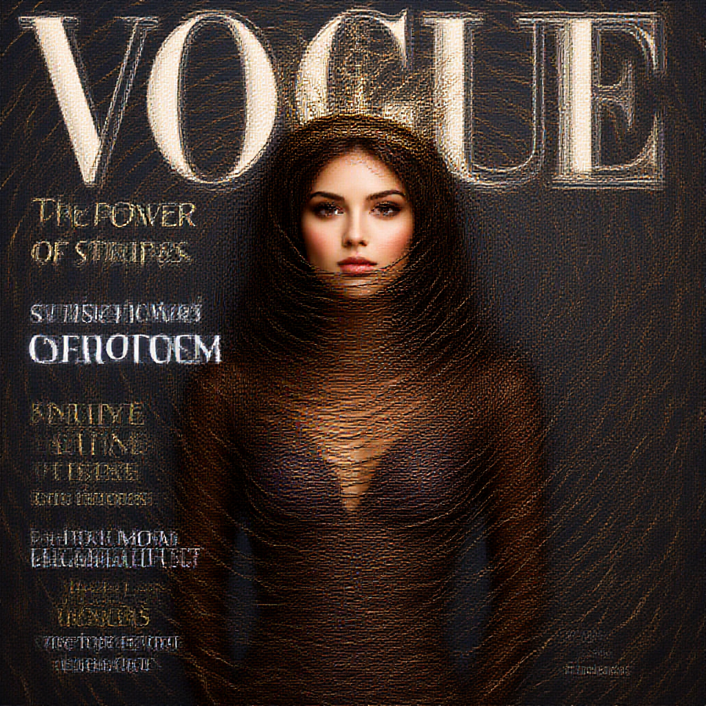 On the cover of VOGUE magazine, a captivating woman is enveloped in a cascade of swirling lines, each stripe weaving a spell of optical illusion. Her form seamlessly merges with the dynamic, dreamlike pattern, while her serene expression peeks through the entrancing layers, offering a touch of mystery. The bold VOGUE logo crowns the cover, shimmering against the imaginative backdrop. Key features include: "The Power of Stripes: Fashion’s Daring Frontier," "Surreal Elegance: Where Art and Style Converge," and "Endless Designs: Defying Conventional Patterns."