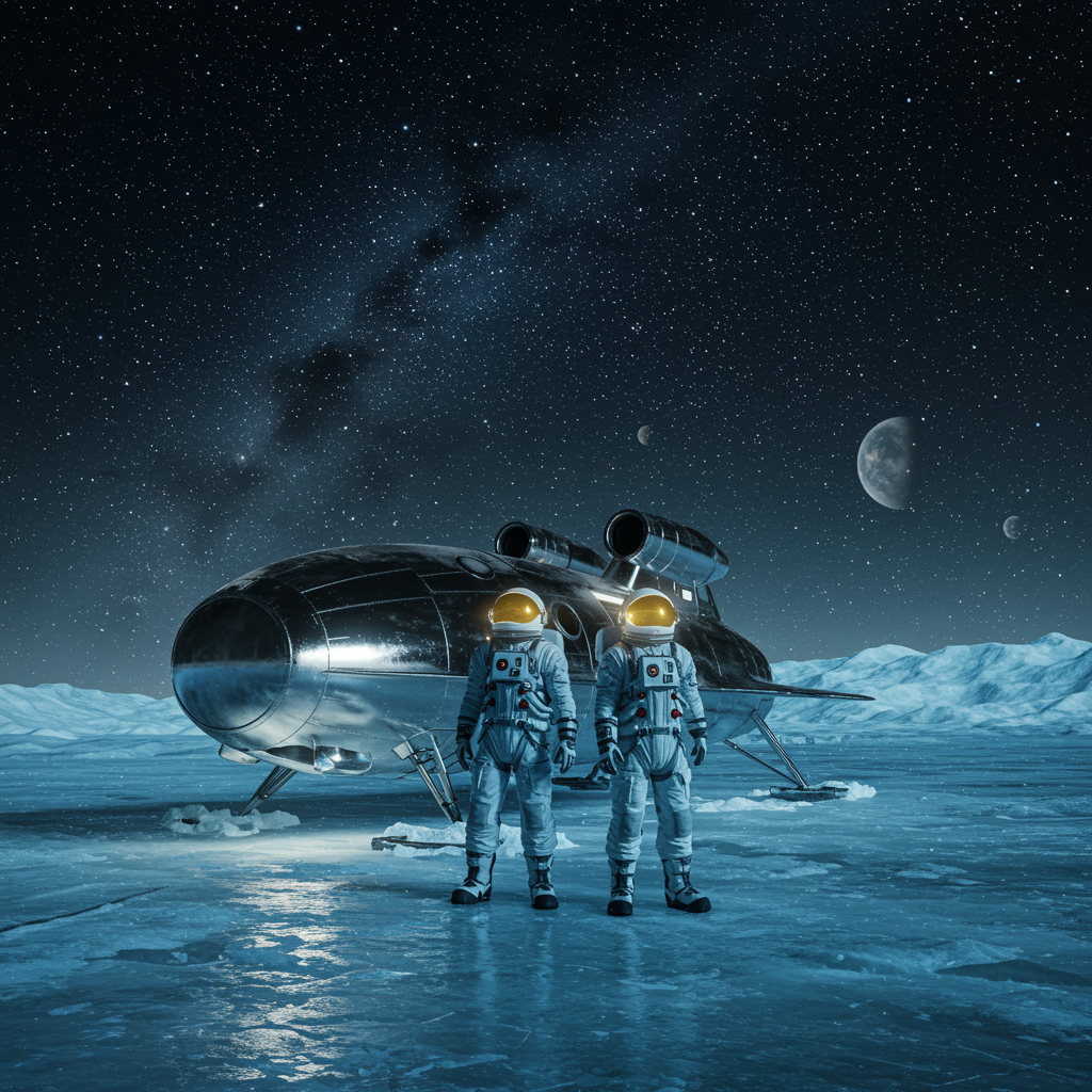 On the frozen surface of an enigmatic icy moon, a pair of astronauts stand side by side next to their sleek, chrome spacecraft. They gaze upward in awe at the vast cosmos, where distant planets glimmer like gems and thousands of stars form a luminous tapestry across the inky sky. Their reflective visors reveal the twinkling lights mirrored on their helmets, encapsulating the breathtaking vista above. A gentle frost clings to their boots as ethereal blue light from the ice beneath adds an otherworldly glow to their surroundings, creating a stunning, ultra-realistic science-fiction tableau.