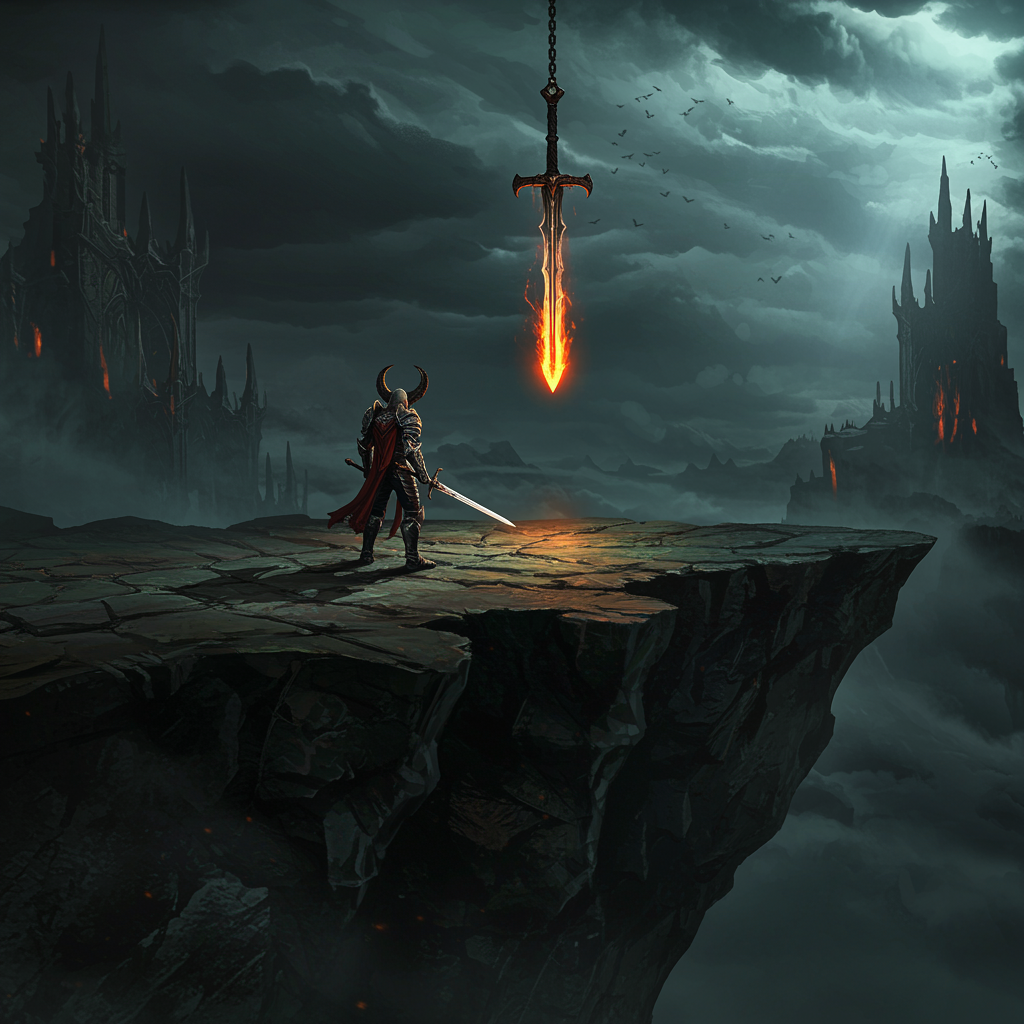 On the precipice where destiny teeters, fate hangs heavy like a sword poised to drop, while the devil’s whisper of temptation echoes through the air. The scene is bathed in dramatic lighting, casting bold shadows and ethereal highlights, as if crafted in a 5D dimension. Rendered with the dark, immersive style of Diablo, the landscape is filled with foreboding structures and ominous skies, each detail meticulously designed to evoke a sense of impending confrontation and otherworldly intensity.