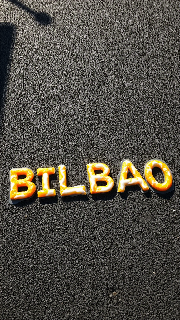 On the sizzling summer pavement, the word "BILBAO" emerges, each letter crafted from fried eggs shimmering under the sun, their edges crisp and golden against the dark, heated asphalt.
