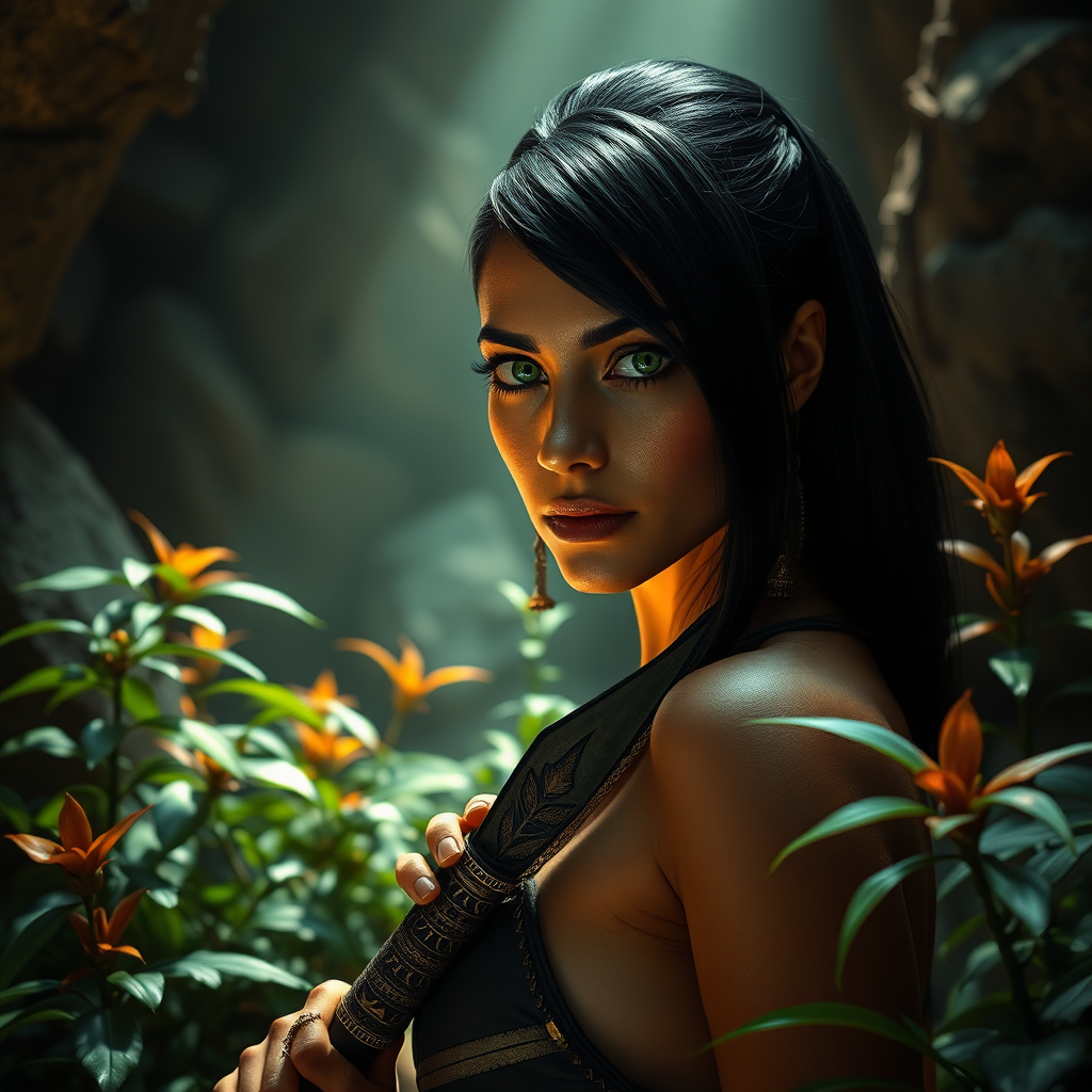 One adult Egyptian woman with striking green eyes and sleek black hair styled in modern flaps, her face adorned with ancient-inspired makeup, stands poised and looking directly at the viewer. Her upper body is depicted amid a richly detailed background that combines an ancient Egyptian theme with the mystique of a feral jungle warrior. She is equipped with an obsidian blade and a stone knife, surrounded by dense bushes and vivid poisonous plants, all set against a backdrop of rugged rocks and a humid atmosphere. This scene unfolds in a dark chamber where dim light casts a cinematic glow, reminiscent of a 1970s film. The atmosphere is rich with high-frequency details reminiscent of 35mm film, complete with subtle film noise. The artistic style channels elements of SAI Pixel Art to enhance its texture and detail.