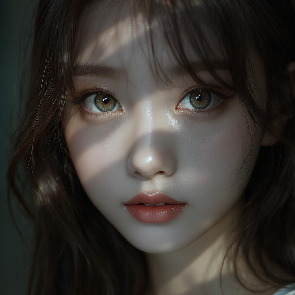 One beautiful Korean girl with exquisite, symmetrical eyes, captured in dramatic lighting. The photo is a high-detail, professional, hyper-realistic RAW image showcasing ultra-high resolution and intricate lifelike textures. The scene is rendered with rich colors and expert photography techniques, using a wide f1.6 lens and cinestill 800 film for a hyperrealistic effect. The visual style harmonizes CGI and 3D artistry, blending elements of anime and digital painting for a unique illustration. The emphasis is on highlighting beauty without distractions like low resolution or artifacts. Every detail is meticulously crafted, avoiding distortions or anomalies to achieve a flawless portrayal.