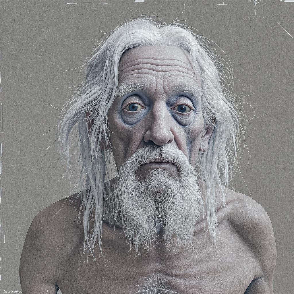 One elderly individual, alone, long silver hair, blurry, abstract style, imperfect anatomy, 3D art, unique makeup, low resolution, distorted features, artistic interpretation, subtle text elements.