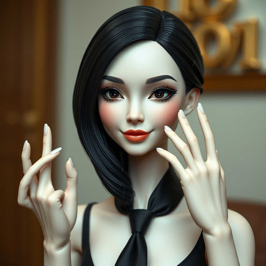 One elegant woman with a posh demeanor, featuring a detailed beautiful face and striking black hair; she wears a tie and has beautiful white, shiny, humid skin. Her expression is a smiling, realistic CGI style. The depiction is in 3D, resembling a finely crafted doll with an octane render. The visual has been crafted in low resolution, resulting in noticeable JPEG artifacts, giving it a slightly surreal appearance with some oddities like extra fingers and mutated hands. The figure is oddly cropped, with portions of limbs missing or duplicated, and with certain features being exaggerated or distorted, further enhancing the uniqueness of the form. The anatomy displays irregular proportions, adding an abstract, almost dreamlike quality to the overall composition, yet maintaining a striking visual impact.