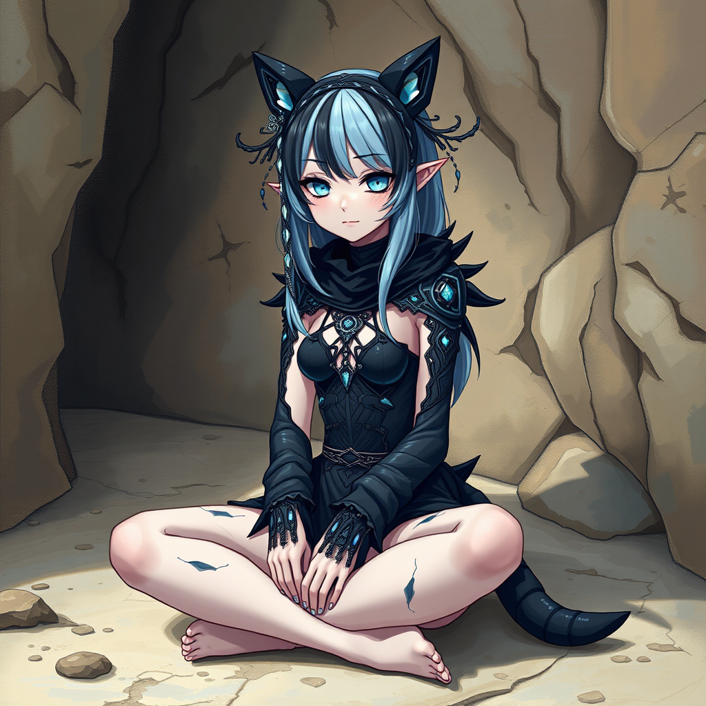 One girl as a Greek priestess with two-tone hair, streaked with plant-like elements, looking cold. Located at the sites of human evolution at Mount Carmel: The Nahal Me’arot/Wadi el-Mughara Caves. Styled as a cyber fairy with grunge elements, sitting cross-legged. Her ice-blue eyes exhibit a gradient effect. She wears an elaborate black-themed animal costume, inspired by a popular one-piece character, intricately detailed with iridescent textures. The setting appears to be an artstation illustration, characterized by its portrait orientation resembling an oil painting. The piece employs a distinctive style with unusual color choices and a surreal atmosphere. Despite these elements, the character maintains a cohesive appearance, with careful attention paid to anatomy and composition. The scene conveys a sense of mystical allure and futuristic edge.