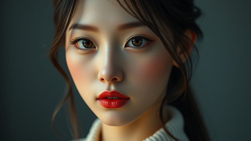 One girl, stunning Korean girl with captivating, detailed eyes, and perfectly symmetrical features, dramatic lighting enhances her elegance, high detail RAW color photo, professional and realistic, ultra high resolution in 8K, showcasing highly detailed CGI, smooth physics-based rendering, a blend of photography and hyperrealism; using a f1.6 lens for rich, vibrant colors and lifelike textures, embodying cinestill 800 qualities; incorporates elements of CGI, 3D art, doll-like perfection, elements of anime and illustration, alongside digital painting and sketch aesthetics. The focus is solely on emphasizing beauty and realism, avoiding imperfections such as blurred or poorly drawn features, or any unrealistic proportions. The portrayal ensures stunning, detailed anatomy, avoiding any errors like duplicated or malformed limbs or features.