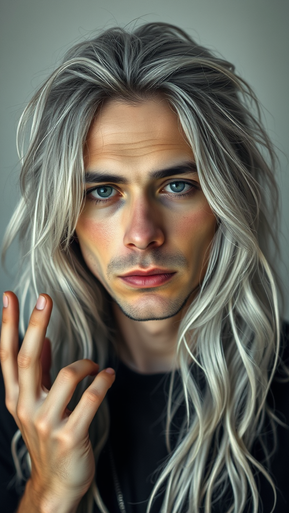 One man with long white and grey hair, portrayed in a 3D render style that incorporates a dreamlike, slightly blurry aesthetic; the artwork embraces unique and unconventional anatomical features for a surreal, artistic effect with elements of abstract composition, incorporating subtle makeup accents amidst an overall low-resolution texture and deliberately exaggerated aspects like unusual hand proportions to enhance the quirky, imaginative quality.