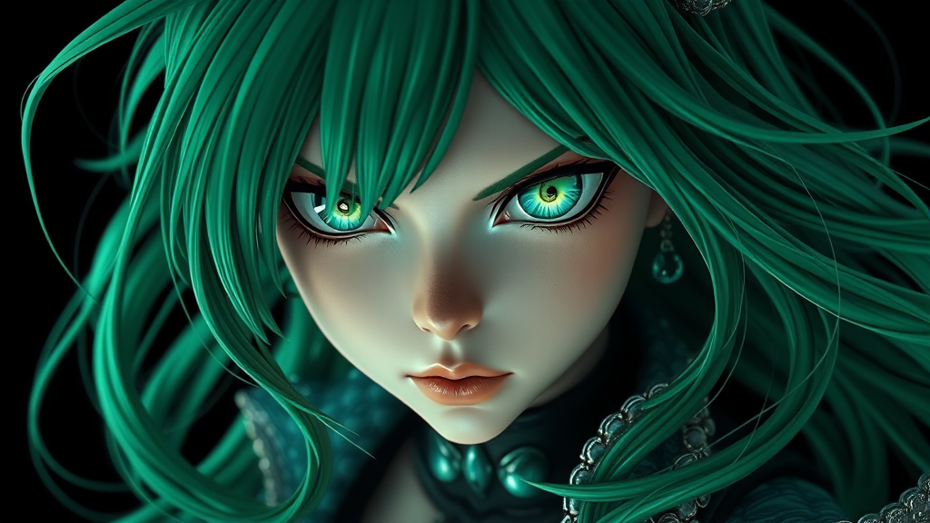 One Punch Man's Tornado gazes intently at the viewer, set against a black background. Her emerald eyes shimmer with a mesmerizing marine scene, capturing a sense of boundless depth. Her attire reflects dolly kei fashion with dragoncore accents, intricately detailed with scales and oceanic motifs. The rendering is hyper-realistic, showcasing every strand of her flowing green hair, her expression intense and captivating. The close-up composition emphasizes her enigmatic allure, as if she is both part of and protector of a mystical underwater world. Her figure is realistic and expressive, embodying a fusion of fantasy and reality.