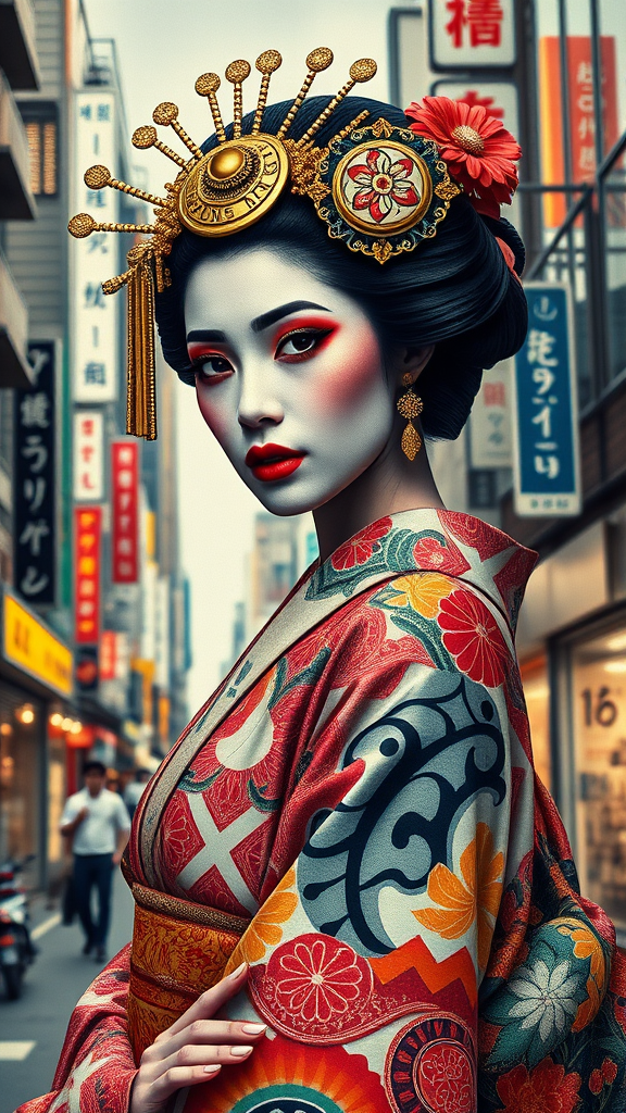 Op art fusion, traditional geisha entwined with hyper-arabic Egyptian aesthetics, dynamic female figure posed in vibrant Tokyo street, accentuated with collage elements, gold bars, and brutalist architecture, Arabic calligraphy woven into graffiti portrait reminiscent of Christian Hilfgott Brand's style, envisioned as behance contest winner, infused with pop surrealism, rendered in behance HD, inspired by DC Comics, reimagined with cinematic flair by Industrial Light & Magic, shimmering in gold and silver --ar 2:3 --q 2