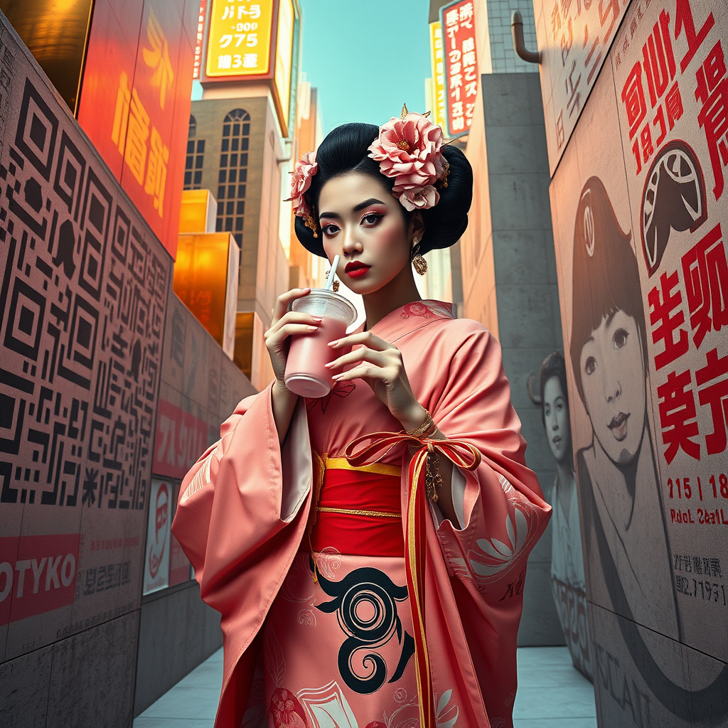 Op art geisha fusion with hyper-kinetic African Sahara architecture meets surrealistic Japanese Street fashion. Arabic-Egyptian calligraphy meets Tokyo City lights in a dramatic diagonal pose amidst giant QR codes, metallic gold blocks, and raised concrete expressing brutalist Tokyo future. Female model sports a transformational superhero cape while sipping a pastel pink bubble tea, amidst stylish graffiti portraits executed in precision cut Arabic calligraphy against a handmade pop art fulfill graphic architecture derived from DC comics world, photographs via Industrial Light and Magic giving it surreal blockbuster-like supreme editorial quality.