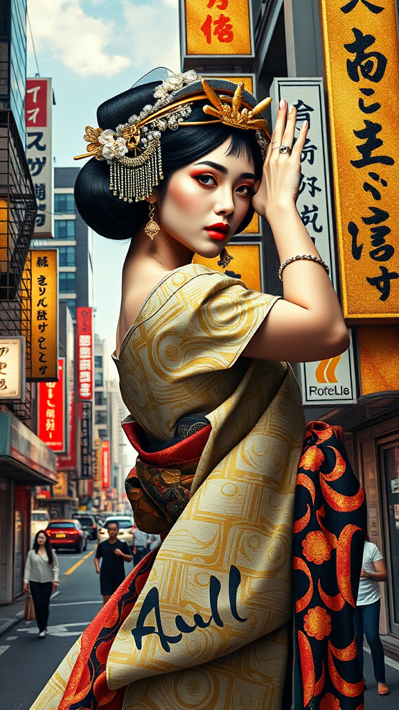 Op art geisha with a hyper-Arabic Egyptian flair, featuring a girl in a striking dynamic pose. Set against the vibrant streets of Tokyo, the scene is a vivid collage with shimmering gold blocks. Brutalist architectural elements intermingle with Arabic calligraphy graffiti, creating a portrait reminiscent of Christian Hilfgott Brand’s distinct style. A Behance contest-winning piece, it exudes pop surrealism with a high-definition aesthetic akin to DC Comics, reimagined by Industrial Light and Magic with intricate gold and silver accents.