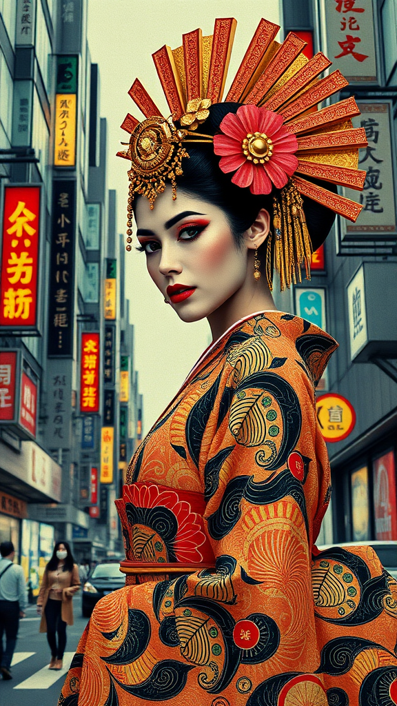 Op art geisha with a hyper-Arabic Egyptian style girl in a dynamic posture, featuring a female model on a vibrant Tokyo street. Collage elements blend with gold blocks and brutalist architecture, intertwined with Arabic calligraphy graffiti. Portrait inspired by Christian Hilfgott Brand, crafted for a Behance contest, infused with pop surrealism. Enhanced in high definition, reimagined by industrial light and magic with gold and silver tones, infused with a DC Comics flair.