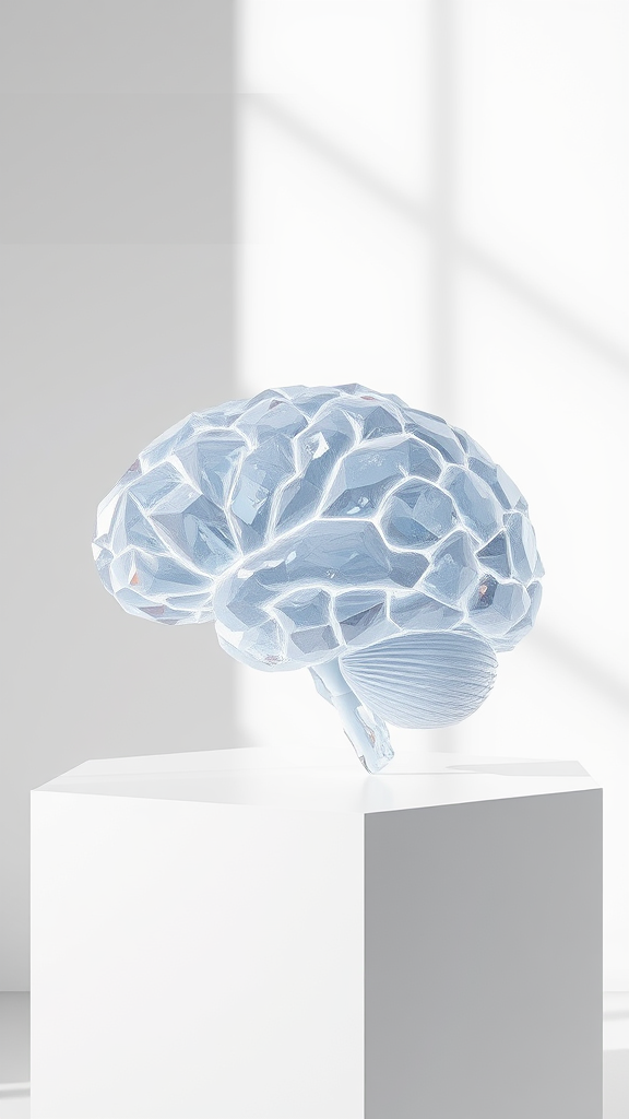 Opalescent digital artistry, a human brain exquisitely rendered in crystal form, resting on a sleek white pedestal, set against a pristine, neutral backdrop, bathed in natural, ethereal light, strikingly hyperrealistic with intricate, high-definition detail, dreamlike yet tangible, captured in stunning 8k resolution.