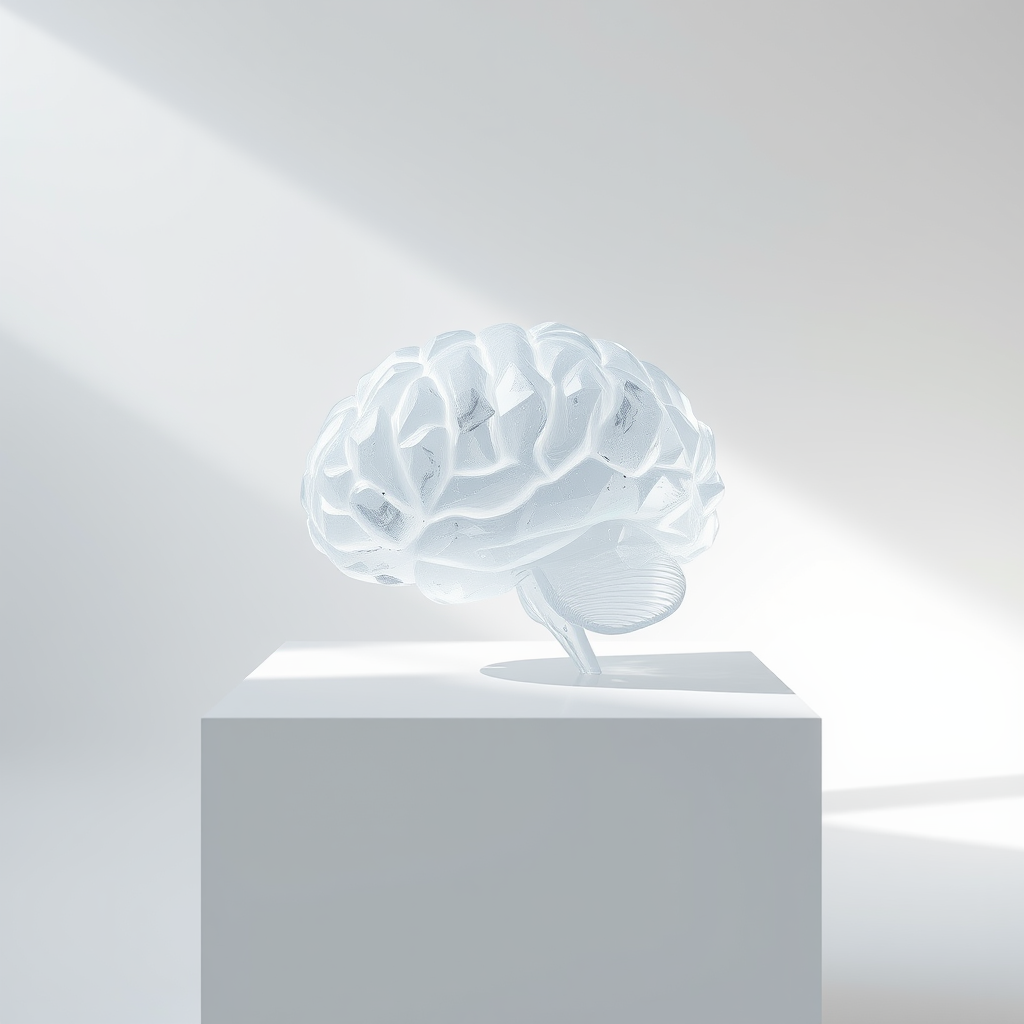 Opalescent digital artistry showcasing a crystalline brain sculpted with precision, positioned elegantly on a sleek white pedestal within an immaculate, minimalist white environment; suffused with gentle natural light, evoking a dreamlike, hyperrealistic atmosphere with intricate detailing captured in stunning 8k quality.