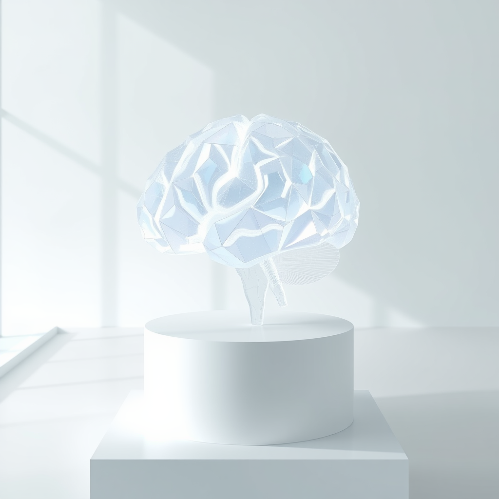 Opalescent futuristic digital design, an anatomically accurate crystal sculpture of the human brain, displayed on a sleek pure white pedestal, set in a minimalist neutral white space, bathed in soft natural light, ethereal and hyperrealistic, intricate details, 8k resolution.