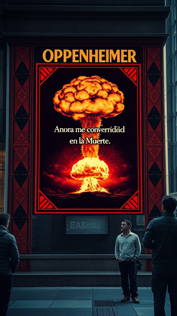 View this AI-generated image featuring oppenheimer movie poster a brooding poster for oppenheimer featuring a dramatic nuclear explosion highlighted by the phrase ahora me he convertido en la muerte el destructor de mundos set in an urban scene where the poster is affixed to a city facade attracting