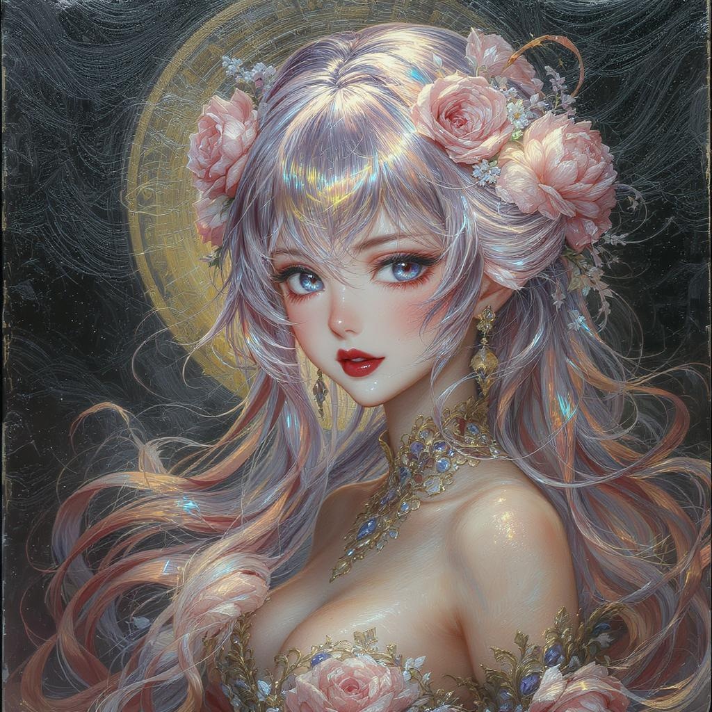 Opulent oil painting illustration of an enchanting anime girl with thick acrylic brushwork, adorned in delicate floral embellishments, her features strikingly highlighted by iridescent glimmers and dramatic chiaroscuro effects, bathed in divine rim lighting that evokes cinematic majesty, complemented by the ornate and lavish details reminiscent of rococo artistry.