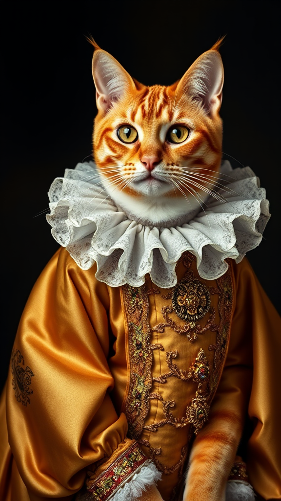 Orange tabby cat adorned in a sumptuous renaissance costume, featuring a lavish ruff collar and an exquisite golden robe. The studio portrait captures the feline's noble demeanor, with detailed embroidery and ornate jewelry enhancing its regal appearance. Set against a dark, dramatic background, the composition highlights a majestic pose, drawing attention to the vivid historical fashion and luxuriant textures, yet with a subtle playfulness in the cat's eyes.