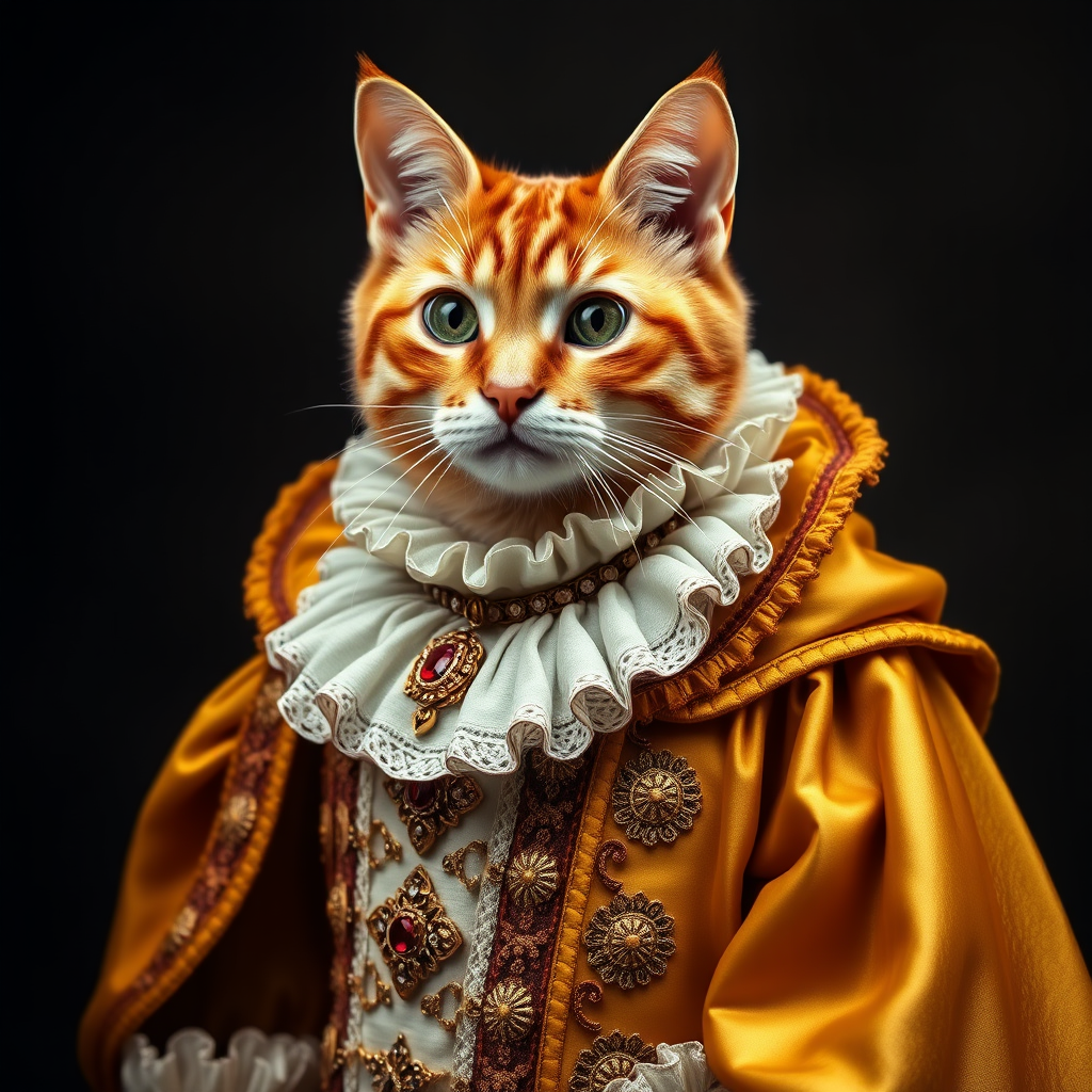 Orange tabby cat in a royal renaissance ensemble featuring a ruff collar and a luxurious golden robe, captured in a studio portrait that exudes a noble presence. The robe is adorned with intricate embroidery and ornate jewelry, set against a dark background that highlights the cat's regal pose. The sharp focus of the image showcases the rich textures of historical fashion, with subtle modifications to the design adding an imaginative flair.